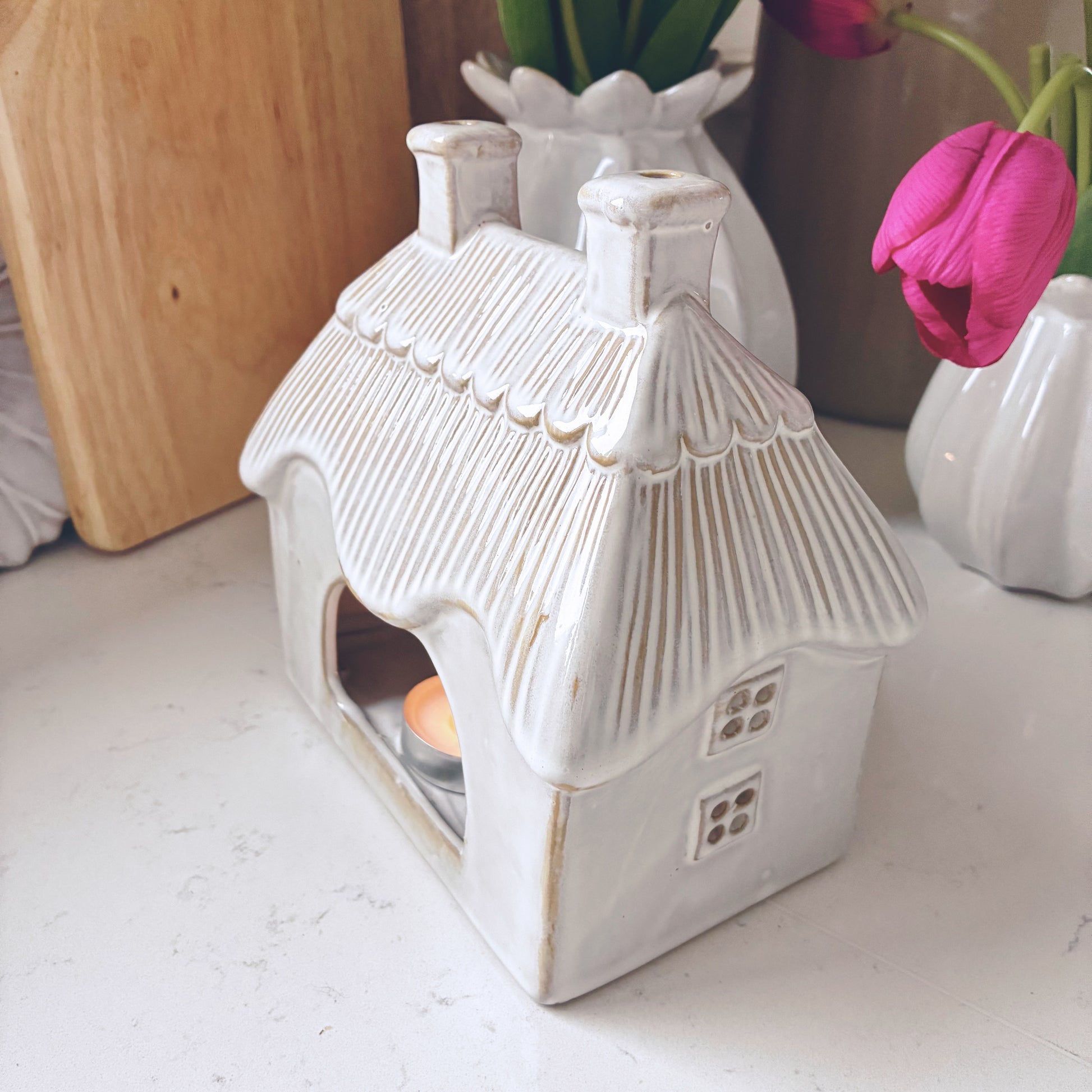 Add a soft glow to your space with this ceramic floral tea light house. Beautifully crafted with delicate floral detailing, it gently diffuses candlelight through its cut-out design to create a warm, inviting atmosphere. Perfect for shelves, side tables, or spring styling, this decorative piece brings charm and comfort to any room.