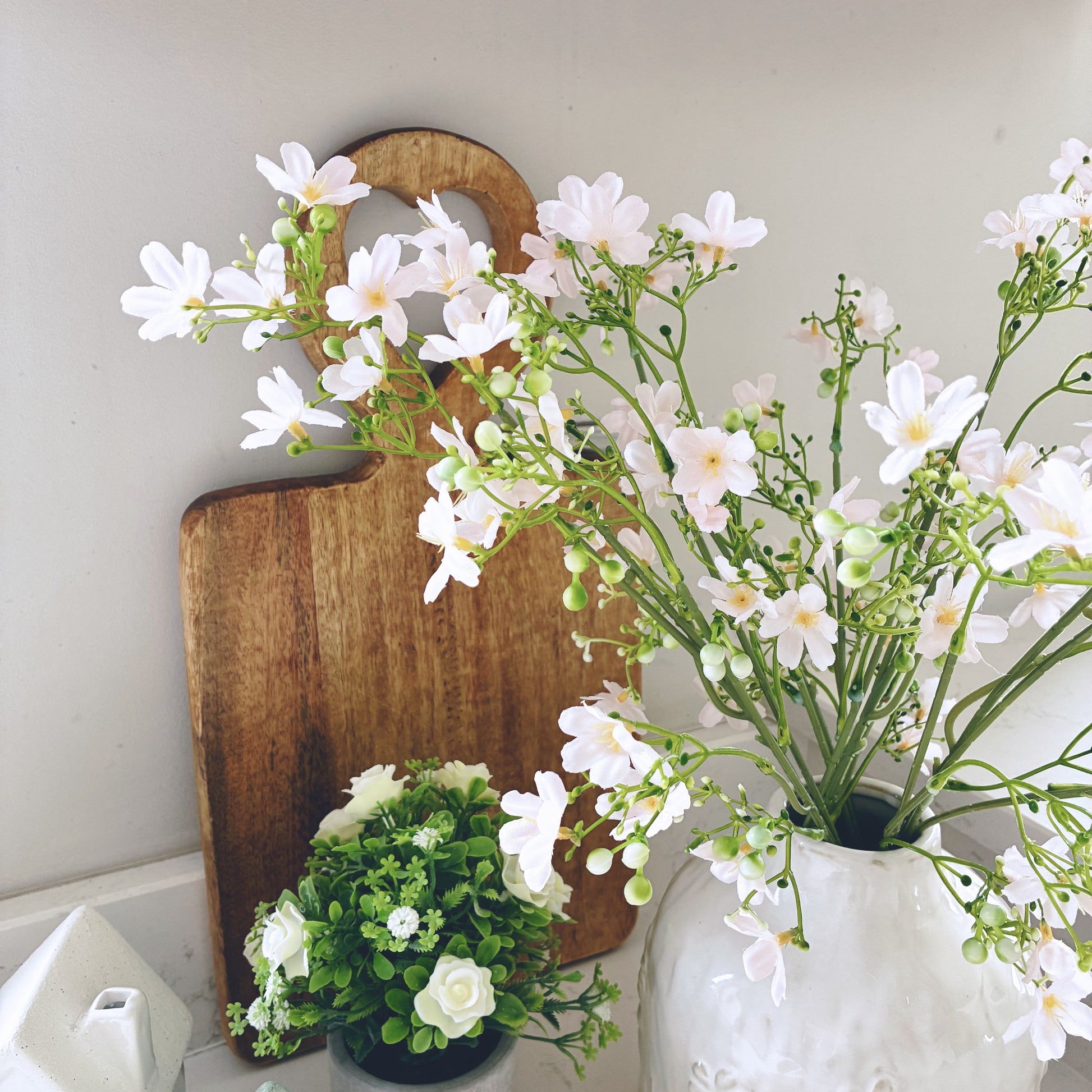 In our website photo, four stems are styled together in a vase to create a full, balanced, and effortlessly luxurious look. The clustered white blossoms add height, texture, and a refined focal point, making them perfect for consoles, coffee tables, bedside styling, or dining centerpieces.