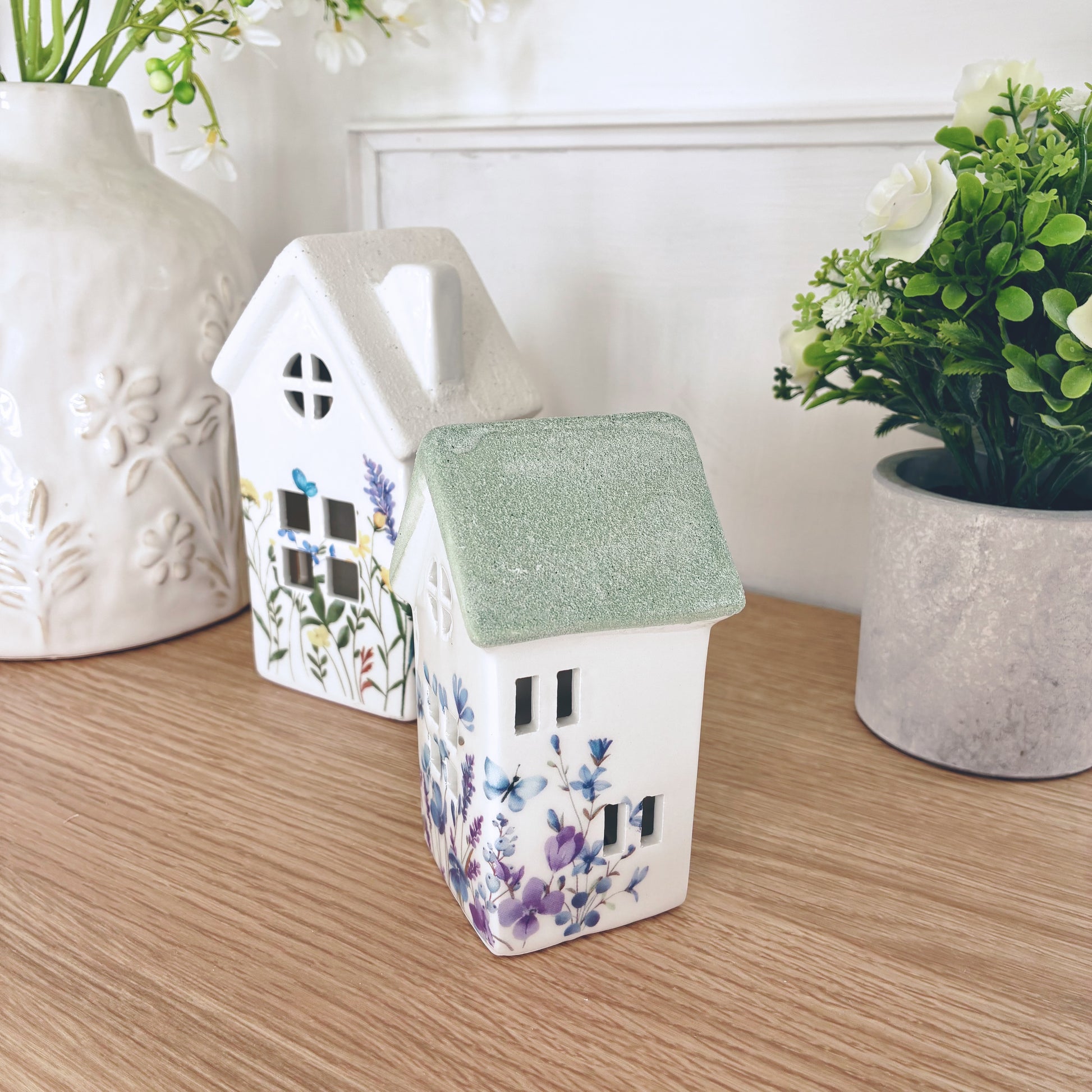 Add a touch of storybook charm to your décor with our Green Roof White-Walled Floral House Decoration. Featuring crisp white walls, a soft green roof, and delicate floral detailing, this piece brings a calm, romantic feel to any space.