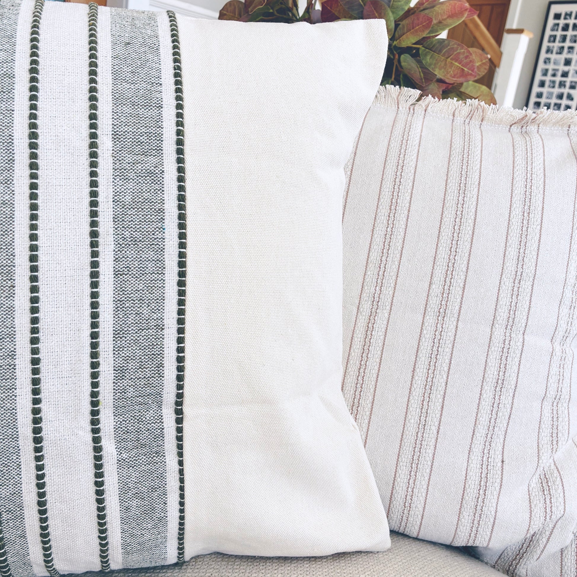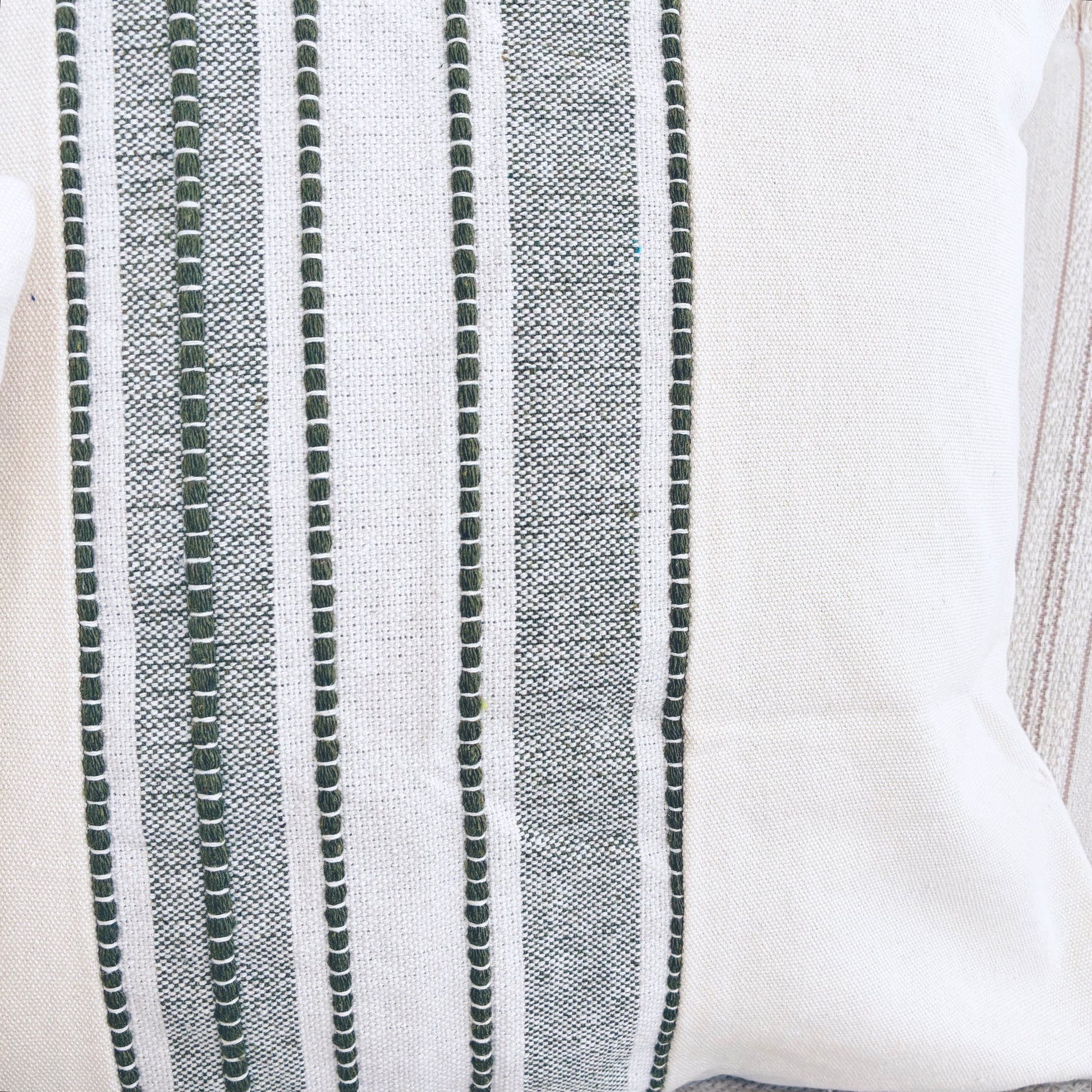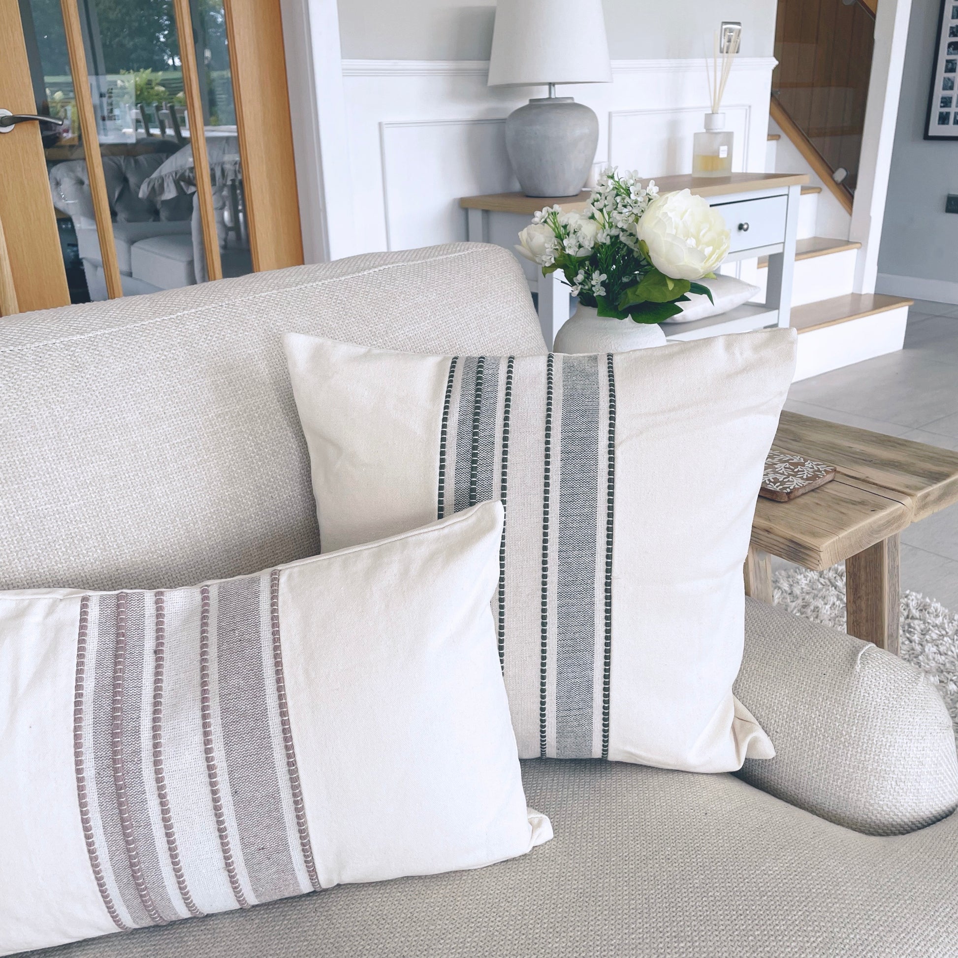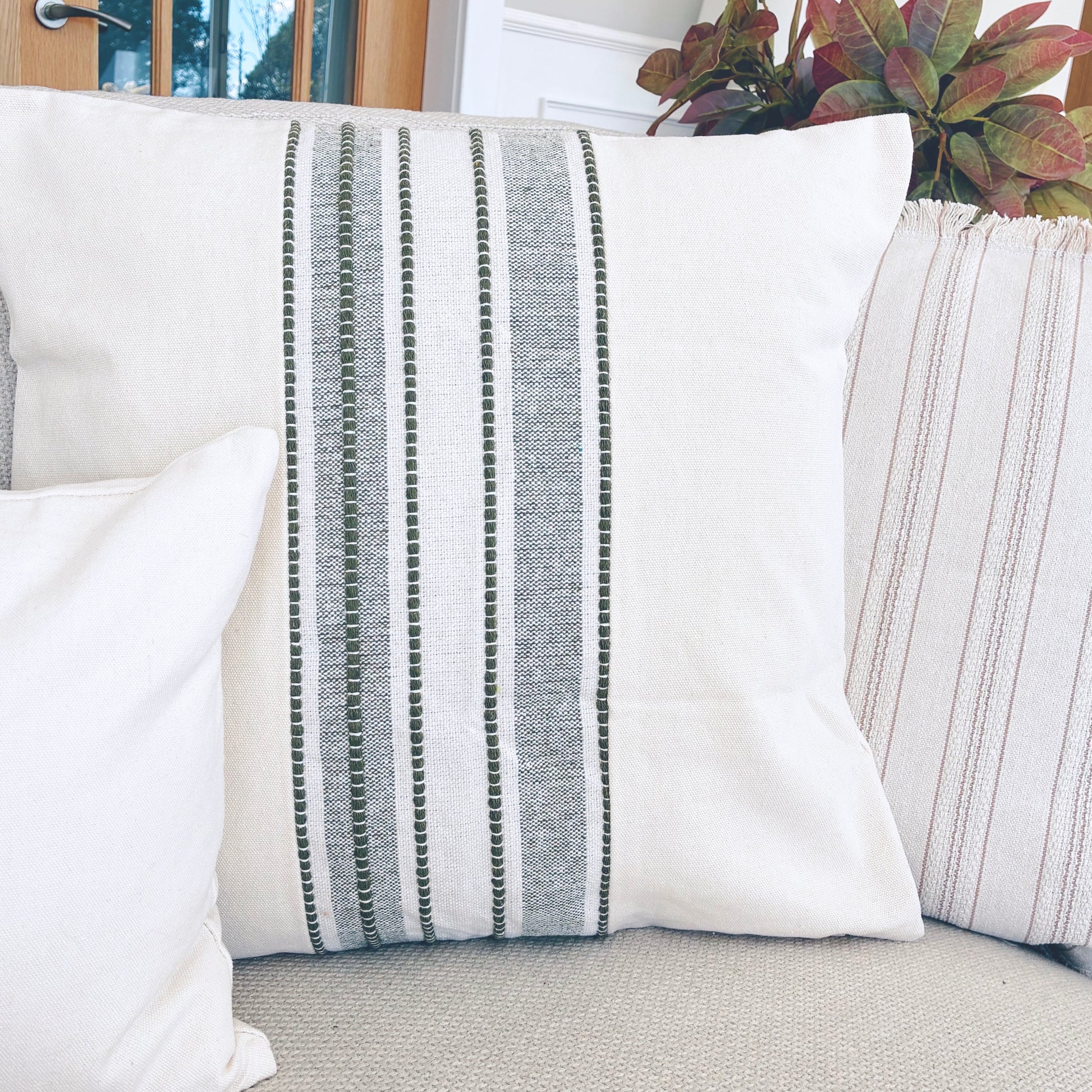 Our square stitched cushion has a gorgeous green stripe with a lovely green stitched detailing to the front. A lovely way to add that little hint of colour into your home