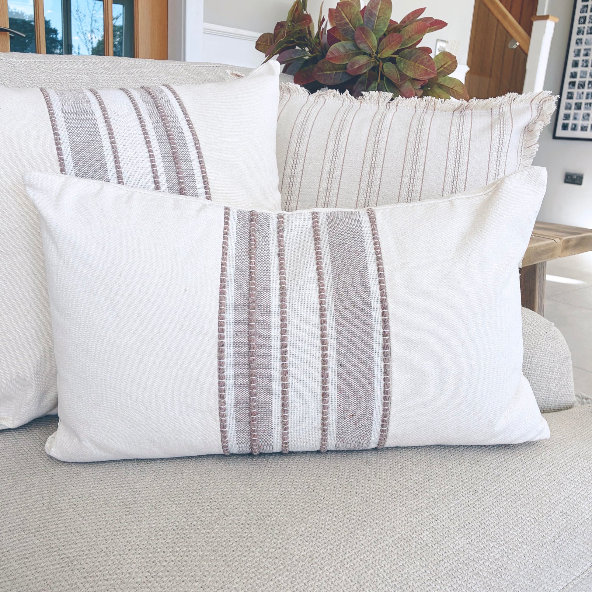 Our long stitched cushion has a beautiful neutral stitched detailing and a soft beige/ taupe stripe running down the centre of the cushion.