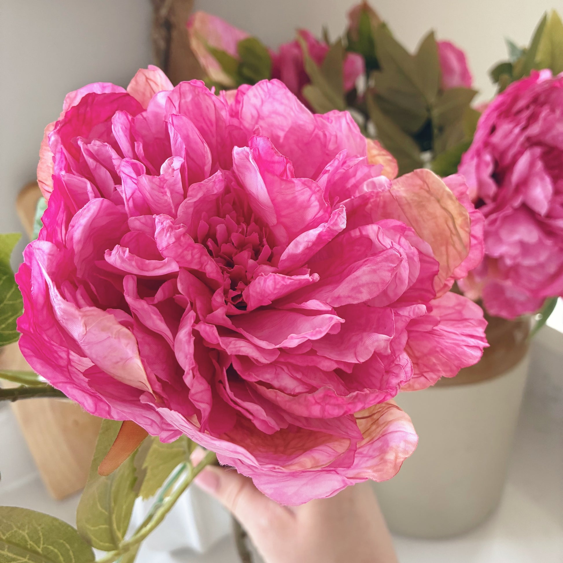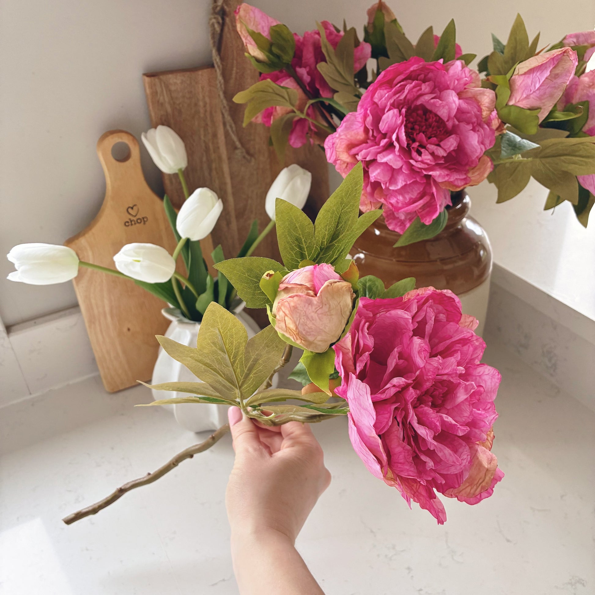 Add a touch of romantic charm to your space with this pink faux peony stem. Featuring full, layered petals and a natural-looking stem with one open bud and one closed bud per stem giving a natural look. It beautifully captures the lush elegance of real peonies without the maintenance. Perfect for styling in a vase on its own or mixed into a floral arrangement, this timeless bloom brings lasting beauty to any room.