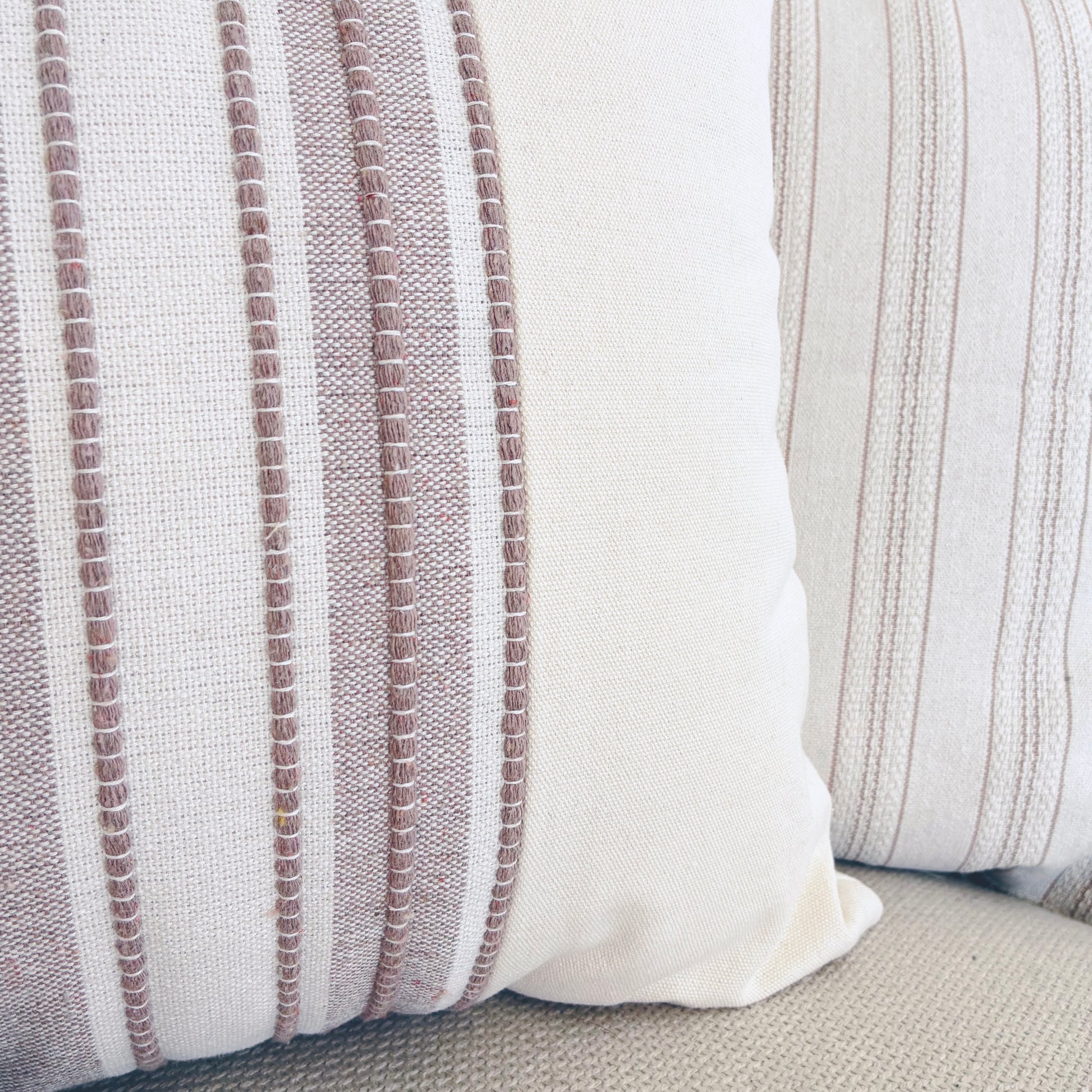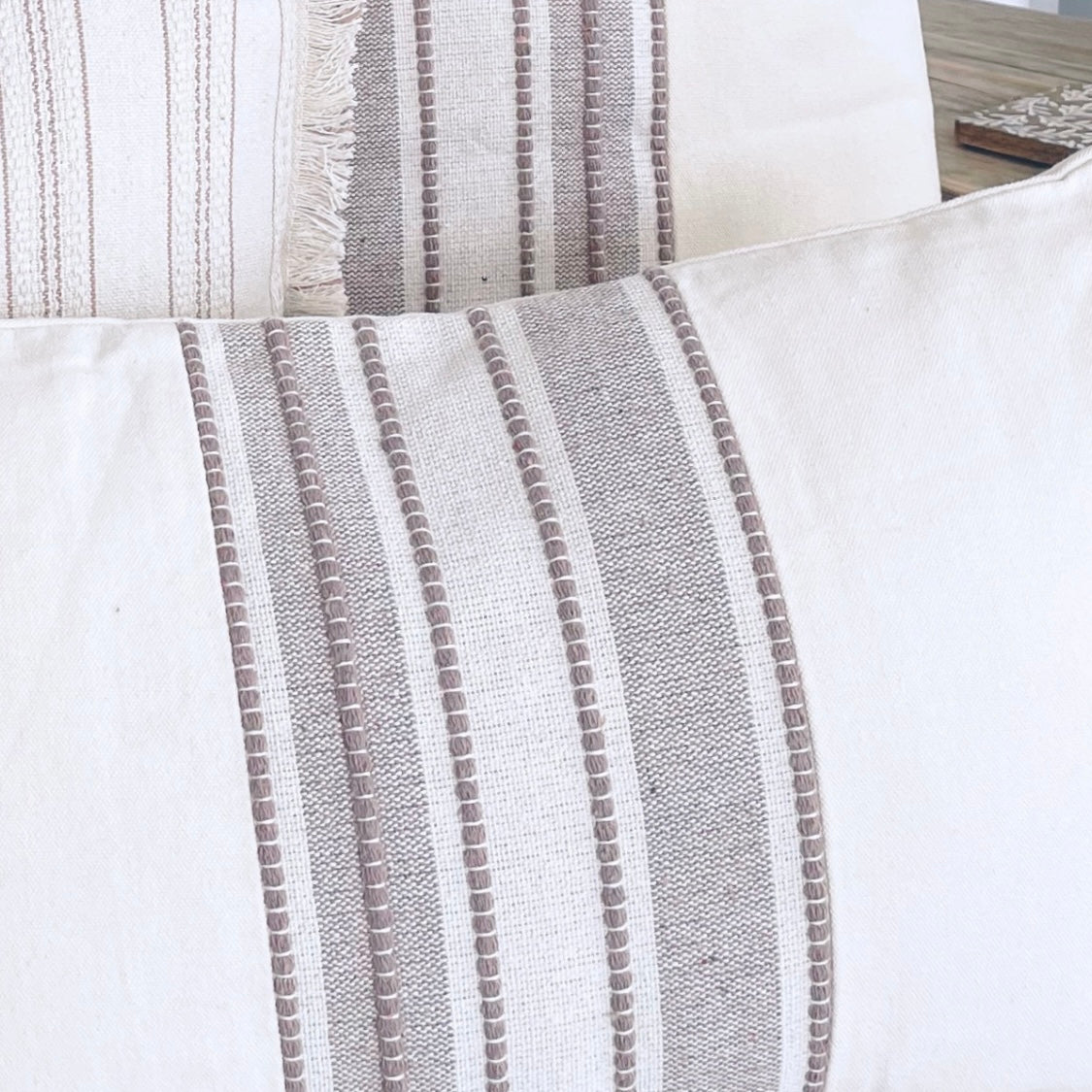 Our square stitched cushion has a gorgeous beige/ taupe stripe with a lovely neutral stitched detailing to the front.