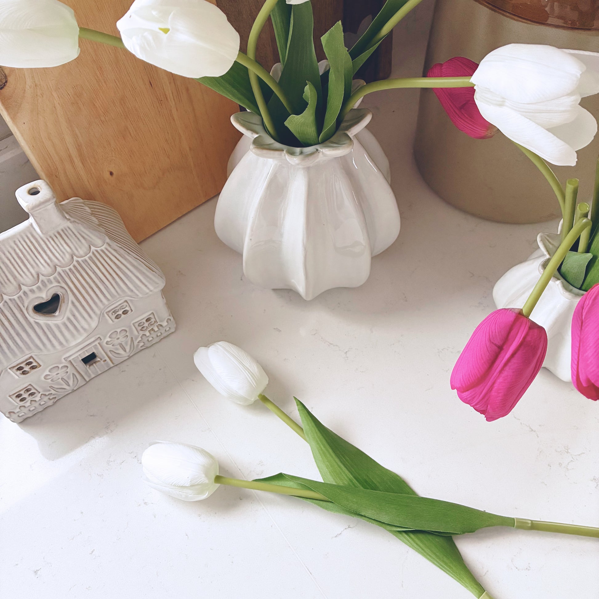 Bring timeless beauty to your space with this white faux tulip stem. Designed with delicate petals and a natural-looking stem, it captures the soft elegance of real tulips without the upkeep. Perfect for styling in a vase on its own or as part of a larger arrangement, this everlasting bloom adds a fresh, refined touch to any room all year round.