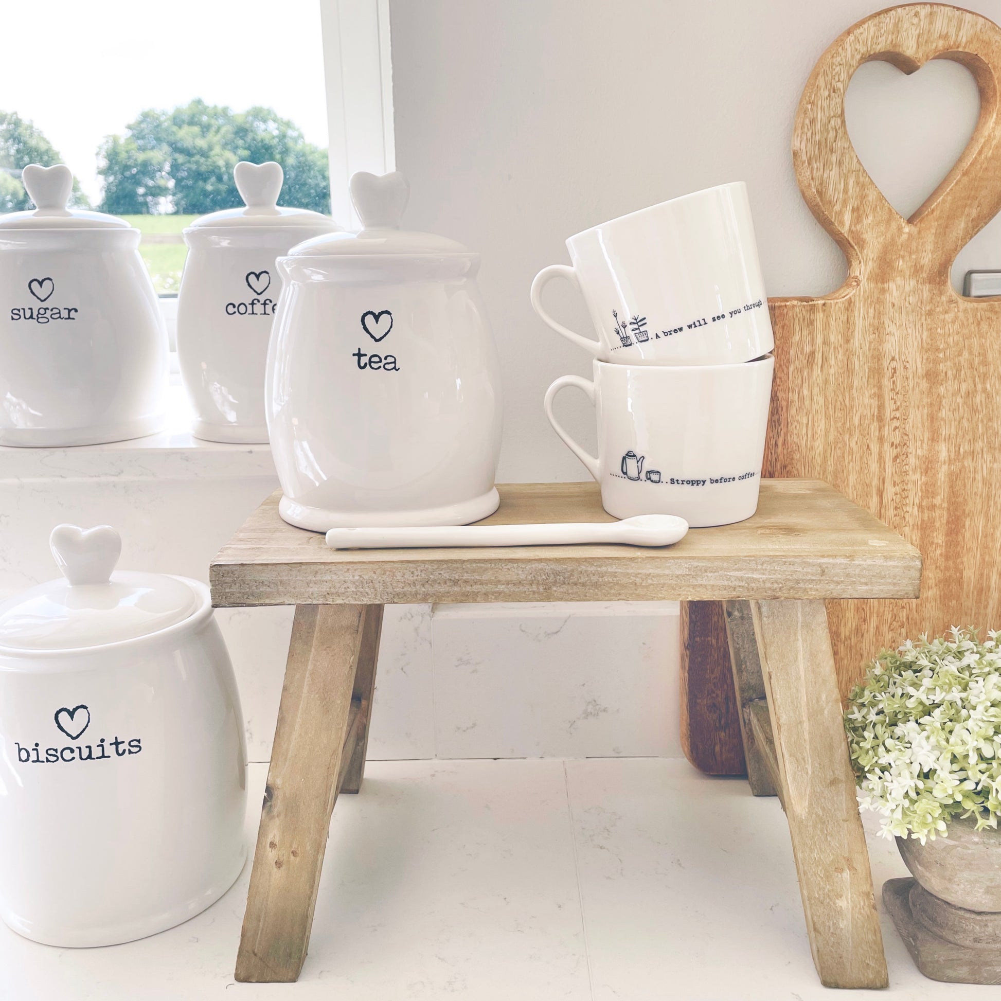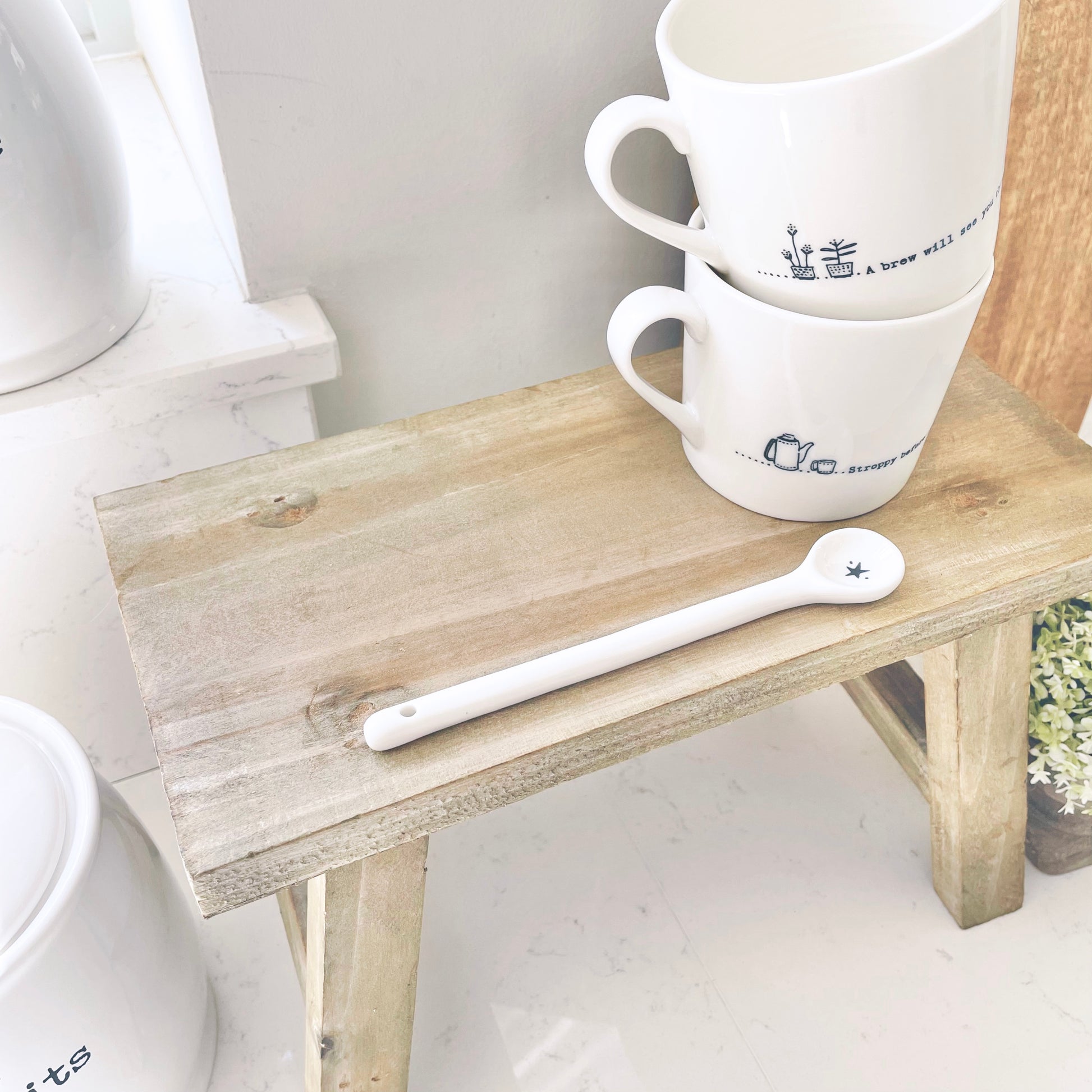 A rustic style wooden stool. The perfect size for use on your kitchen top for kitchen styling and accessories or would also be perfect in the bathroom for toiletries, on your fireplace for winter styling… the possibilities are endless. A lovely styling piece. We’ve also shown it here used as a little side table… perfect for a little reading spot